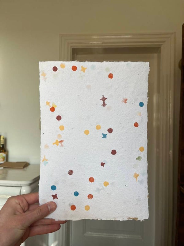 Met de hand gemaakt van gerecycled papier dat anders verloren zou gaan. Elk vel is uniek, met een natuurlijke textuur en subtiele imperfecties die het ambachtelijke karakter versterken. Perfect voor scrapbooking, journaling, bedrukking en andere creatieve projecten.